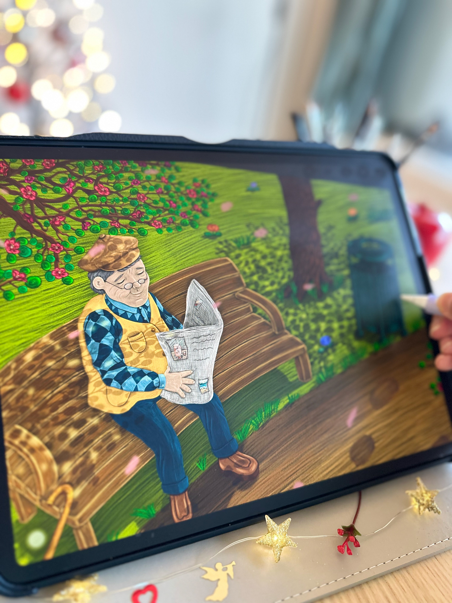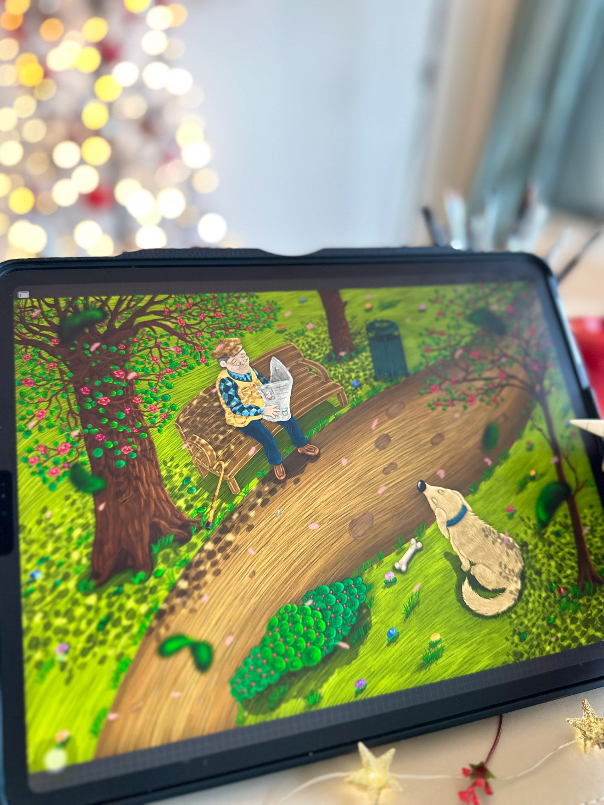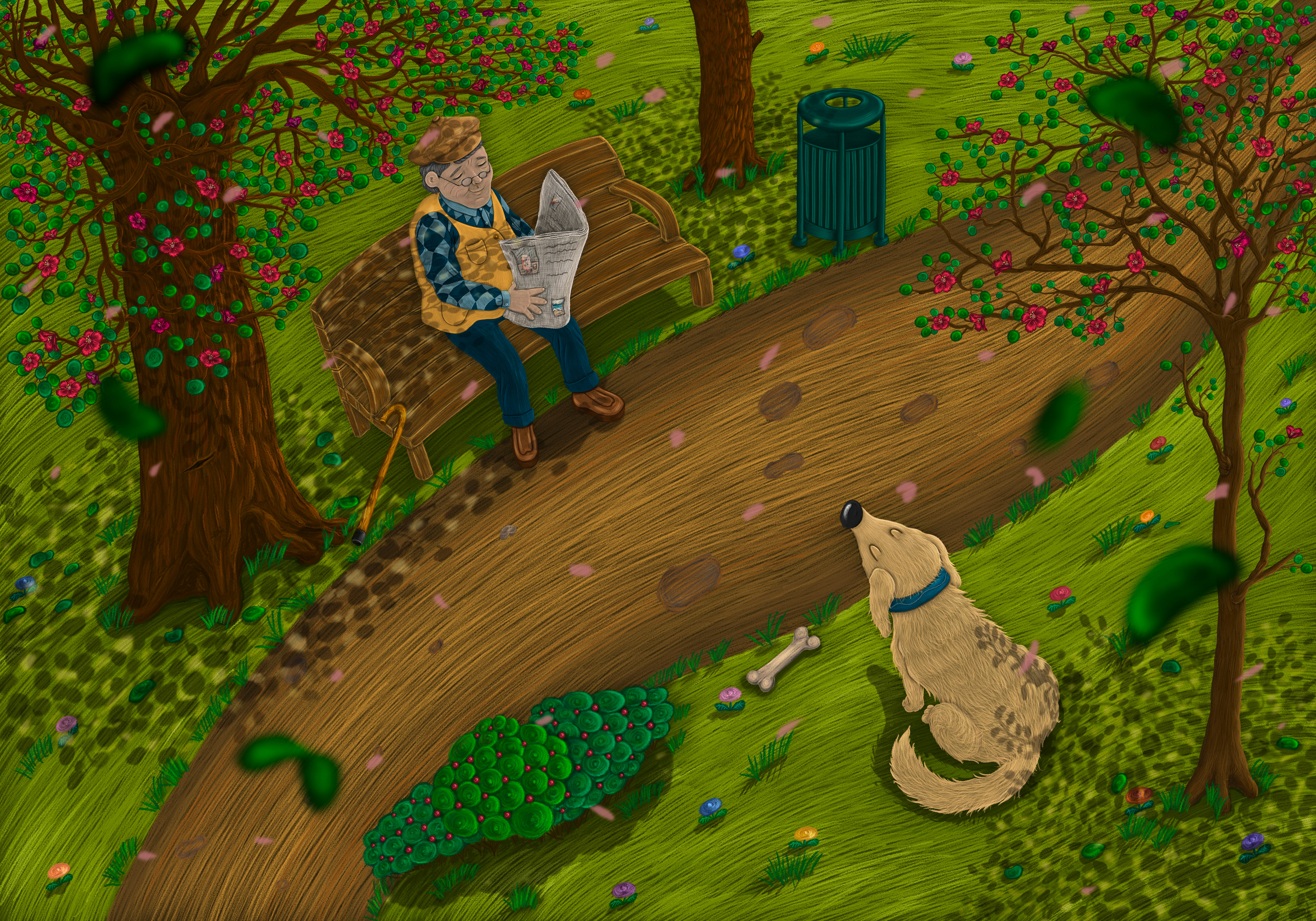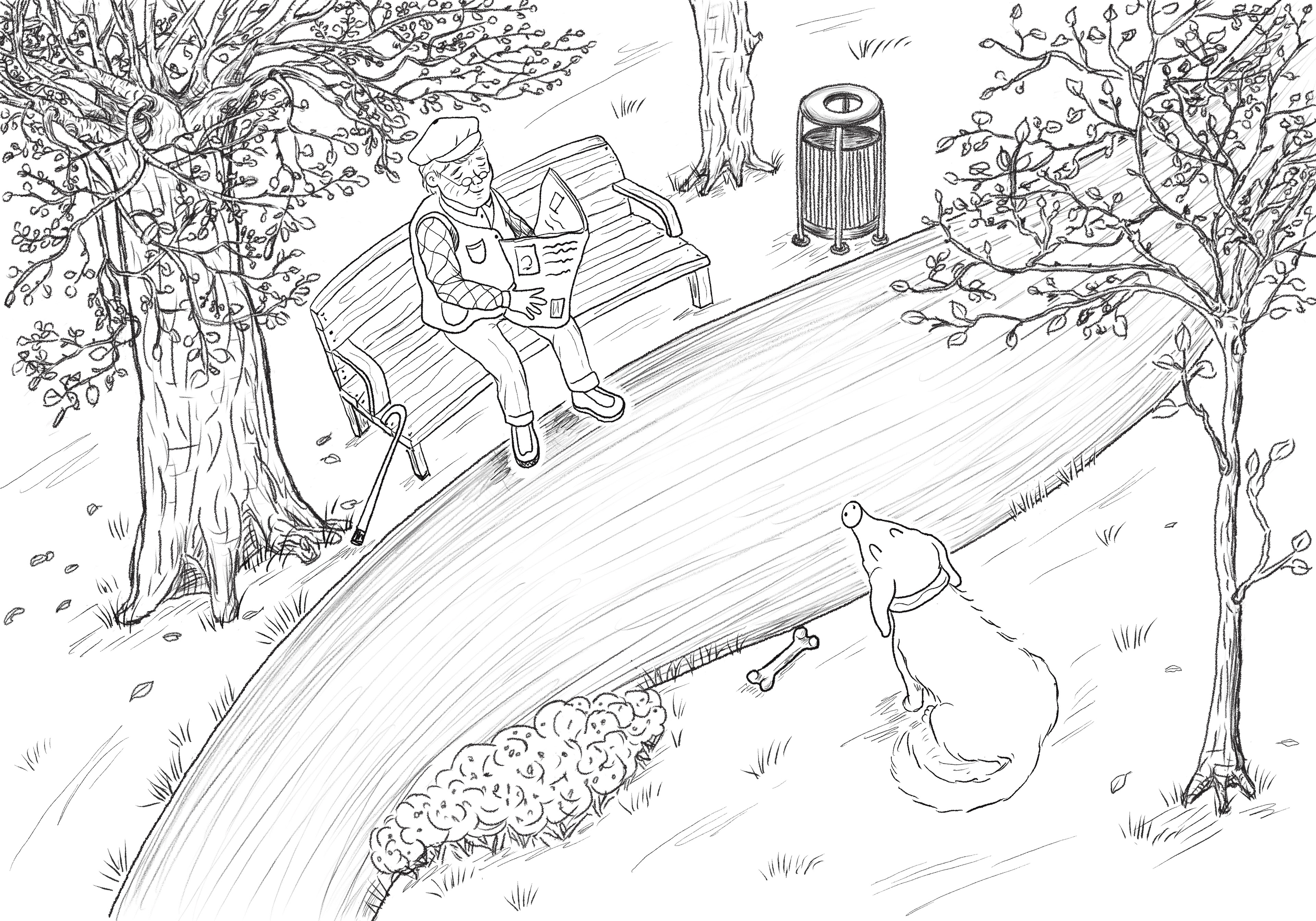 There was a gentle breeze among the branches, causing the leafs to dance. The old man was sitting on a wooden bench, reading his newspaper and enjoying the beautiful weather. A white dog was barking happily in front of him.