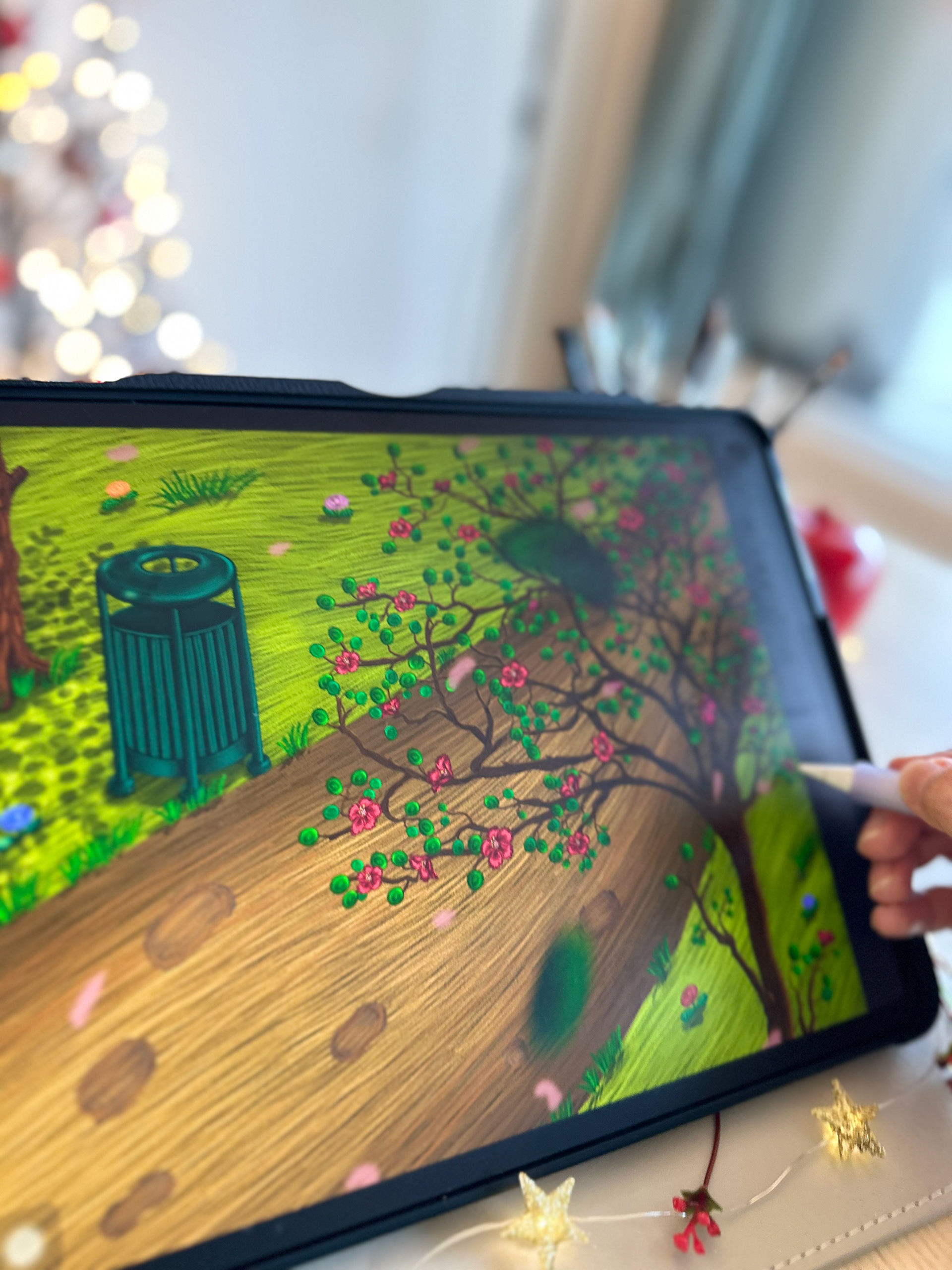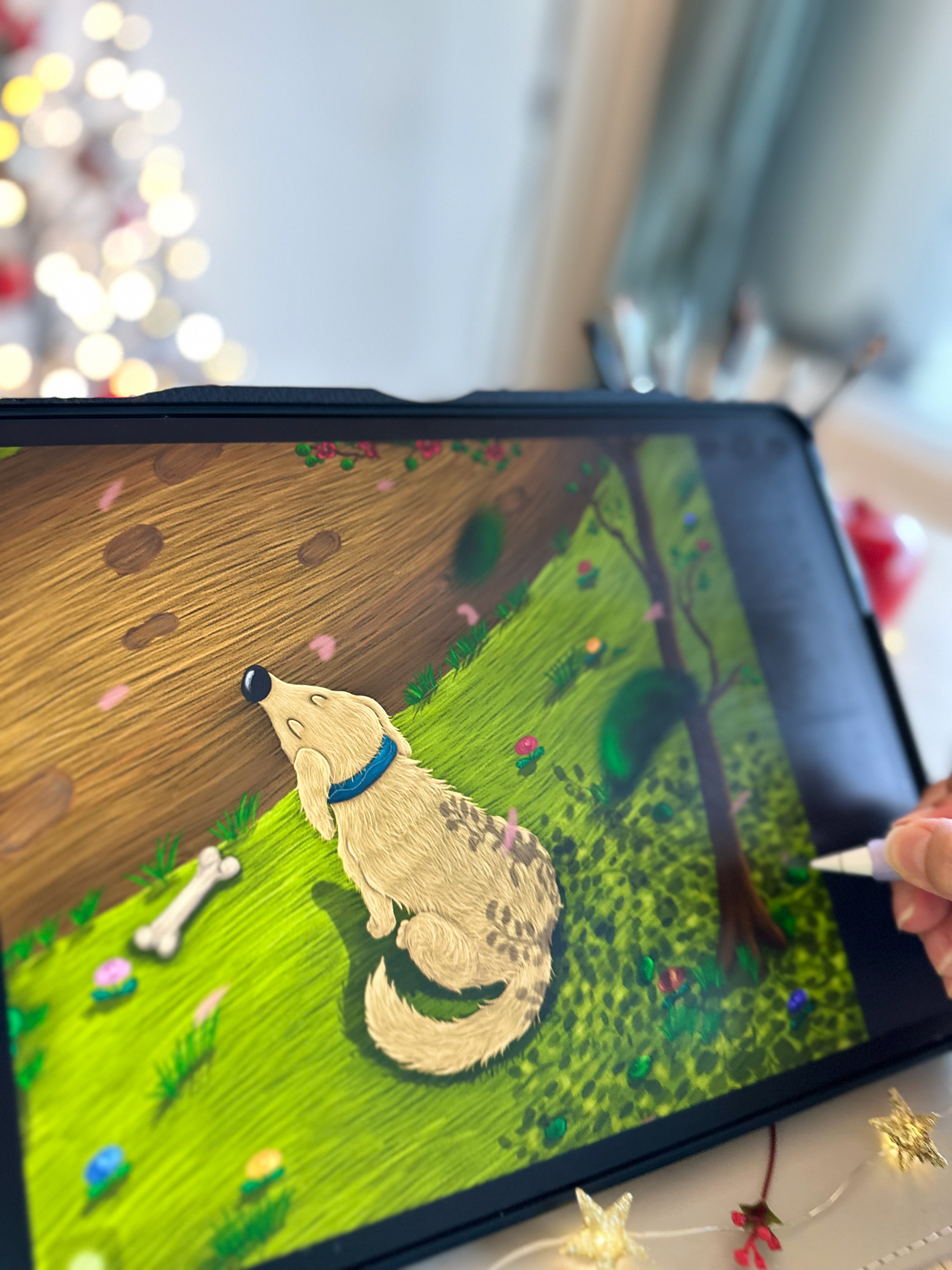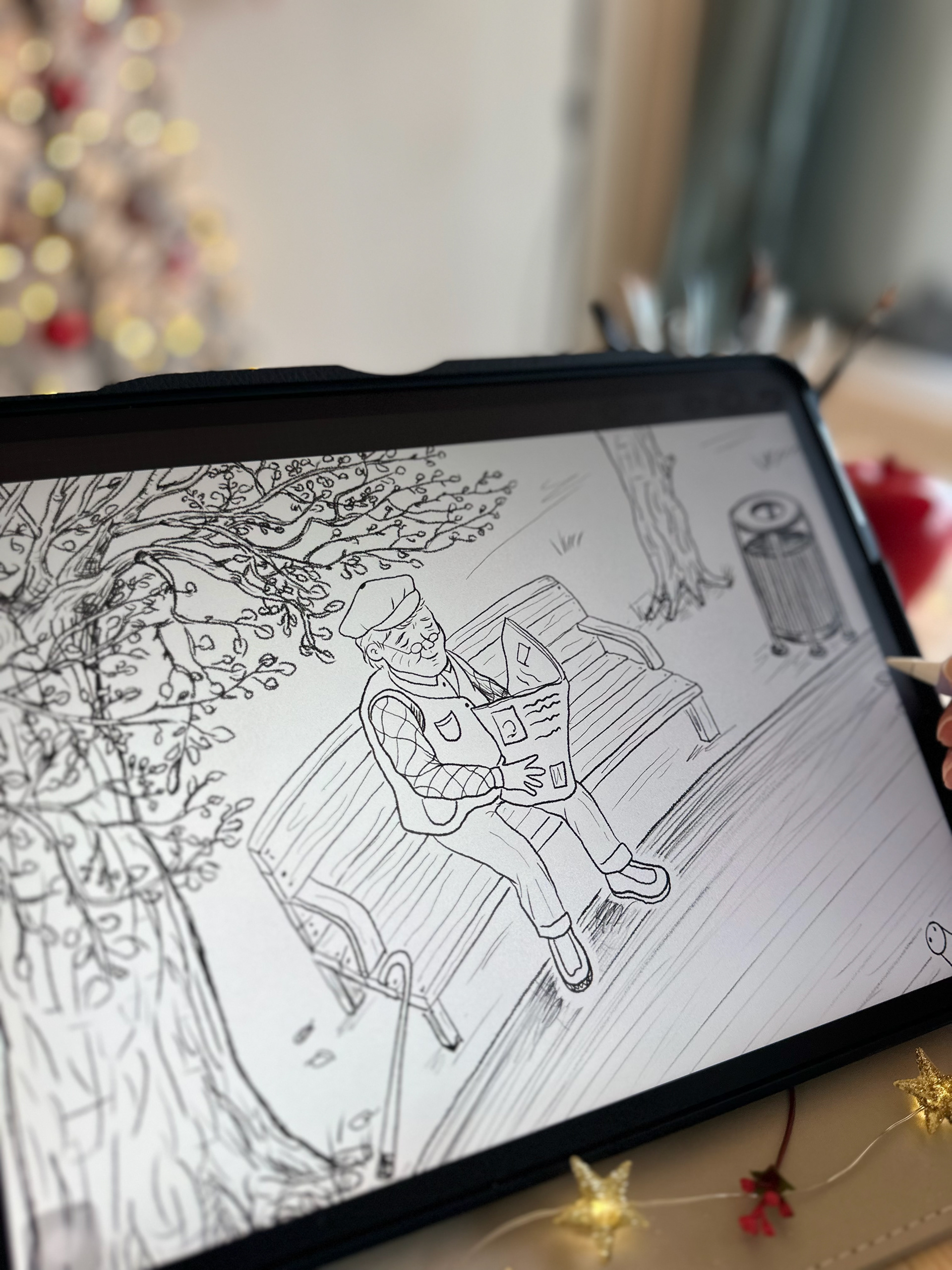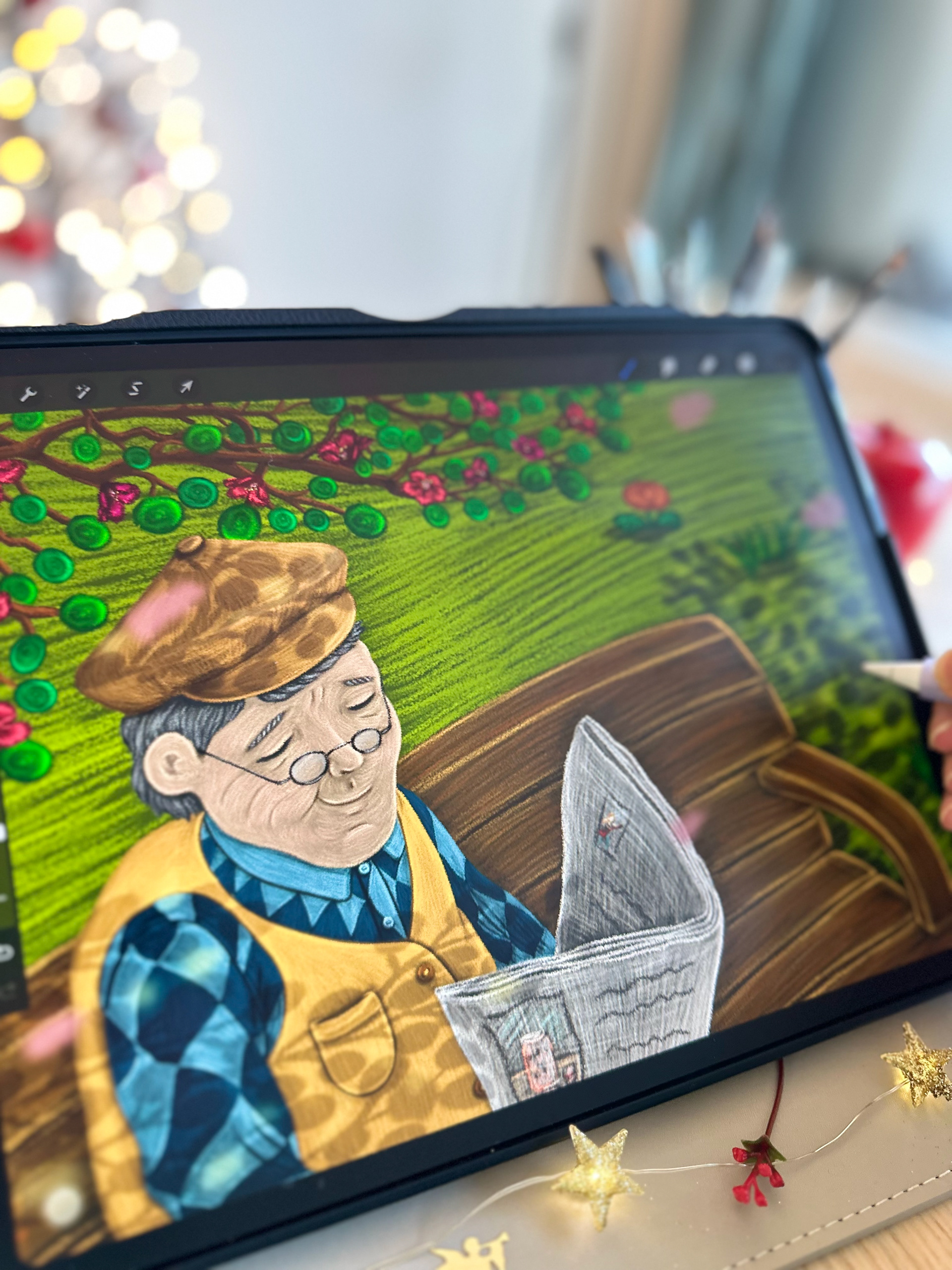 There was a gentle breeze among the branches, causing the leafs to dance. The old man was sitting on a wooden bench, reading his newspaper and enjoying the beautiful weather. A white dog was barking happily in front of him.